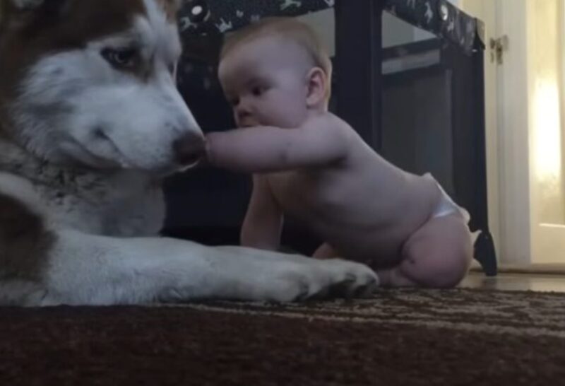 Egy ilyen hosszú türelem után a csintalan husky úgy dönt, hogy barátságukat magasabb szintre emeli. Hanyatt fordul és közelebb kerül a babához, boldogan csóválva a farkát.